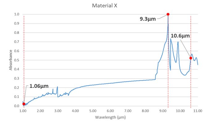 FTIR spectroscopy: Graph indicating high absorption of the 9.3 μm wavelength for an example homogeneous material X