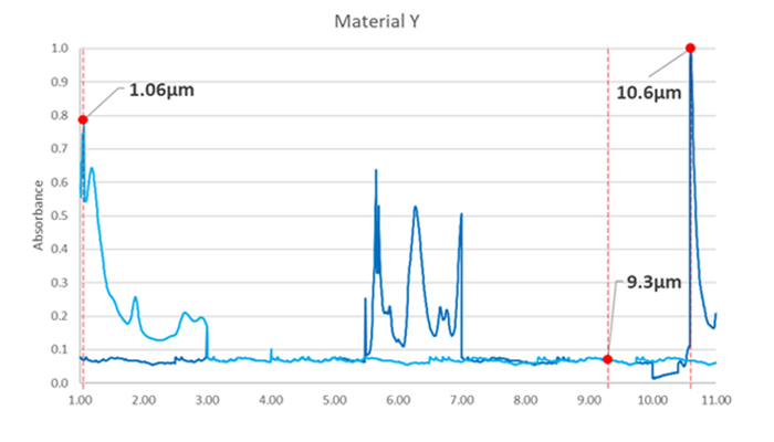 FTIR spectroscopy: Graph indicating high absorption of the 10.6 μm and 1.06 μm wavelengths for an example heterogenous material Y.