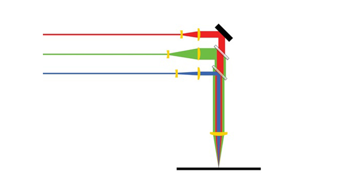 Illustration of MultiWave Hybrid Technology: Multiple laser wavelengths are combined into a single coaxial hybrid beam, all focused at the same focal plane.