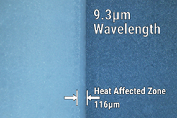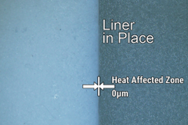 The original 5519 report describes a conformable silicone interface pad filled with thermally conductive ceramic particles and protected by PET liners on both sides. ULS testing documented that a combined 9.3 µm CO2 and 1.06 µm fiber MultiWave Hybrid™ configuration produced smooth processed edges with minimal heat effects, while the PET liners absorbed much of the visible heat impact.